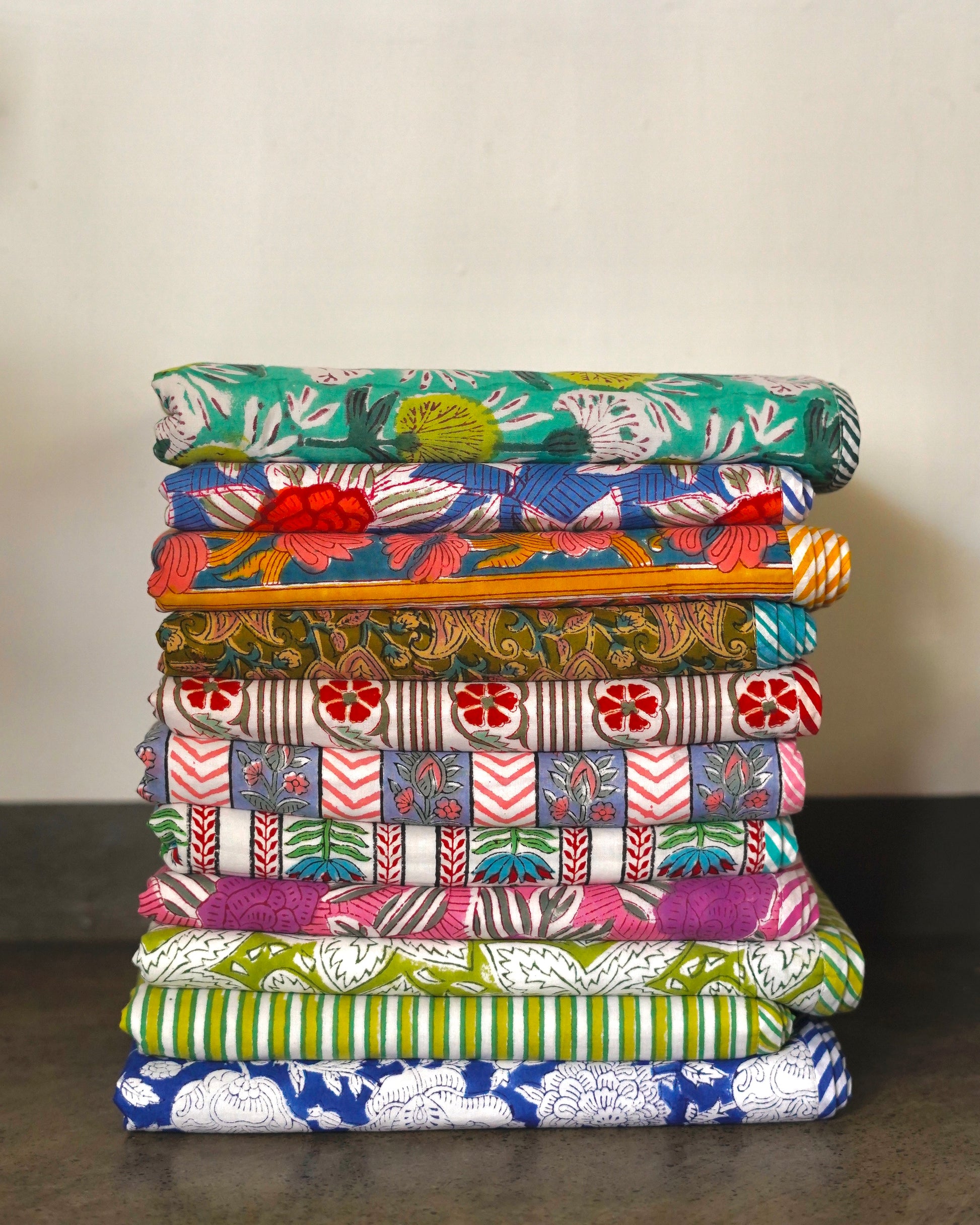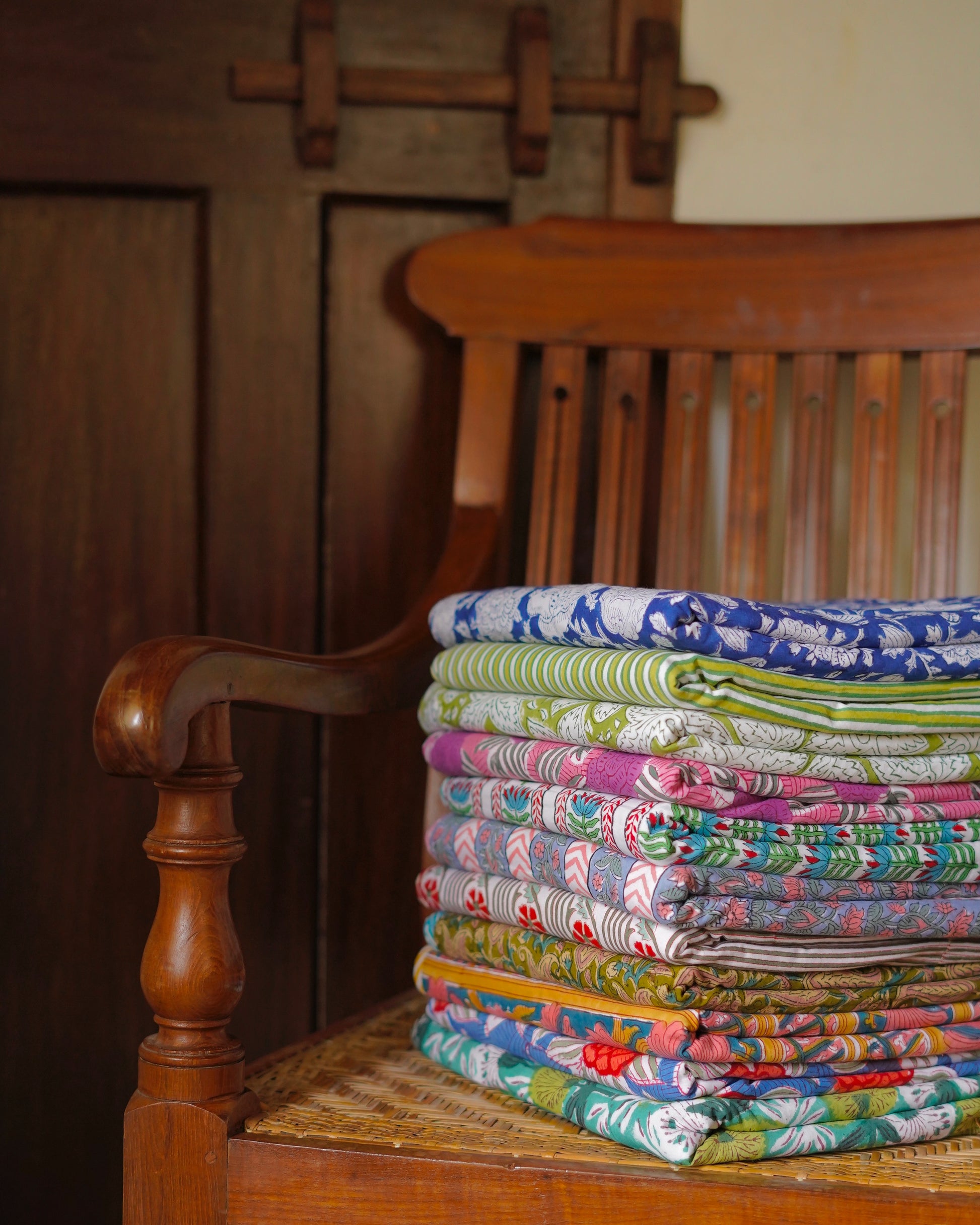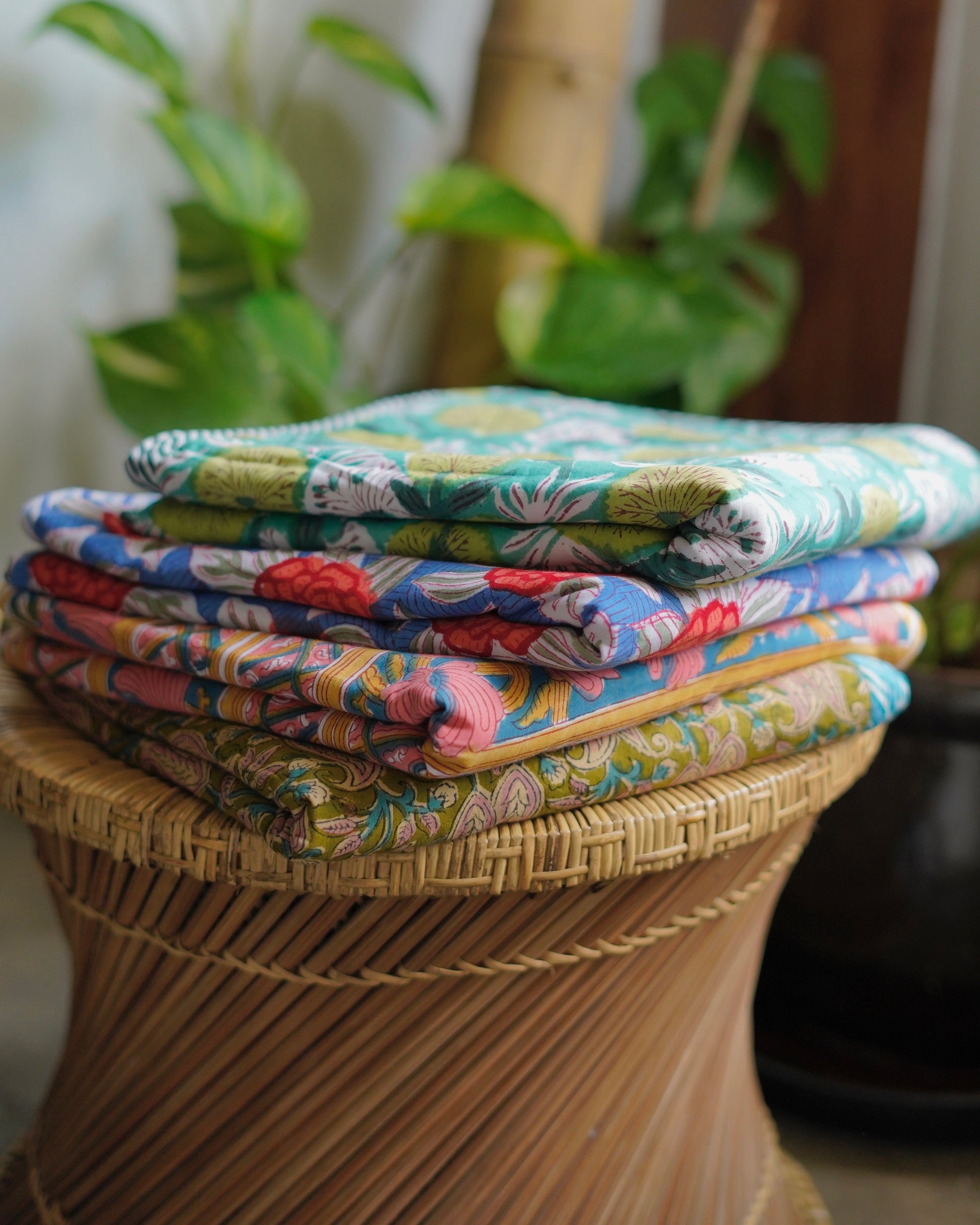 Our baby blankets are made using traditional Indian block printing on pure, breathable cotton. Each piece is crafted with three ultra-soft layers—light, airy cotton on the outside and a thin flannel-like layer in the center—to keep your little one cozy without overheating.
