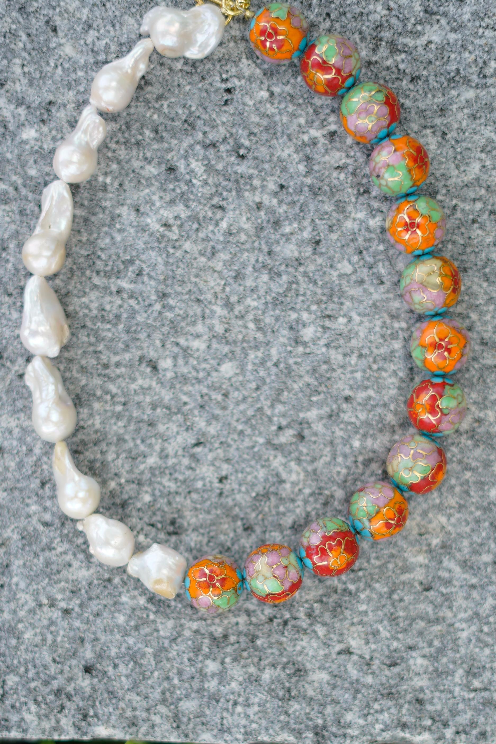Stunning necklace featuring rare vintage cloisonné beads and luminous baroque pearls, creating a balance of color, texture, and history.