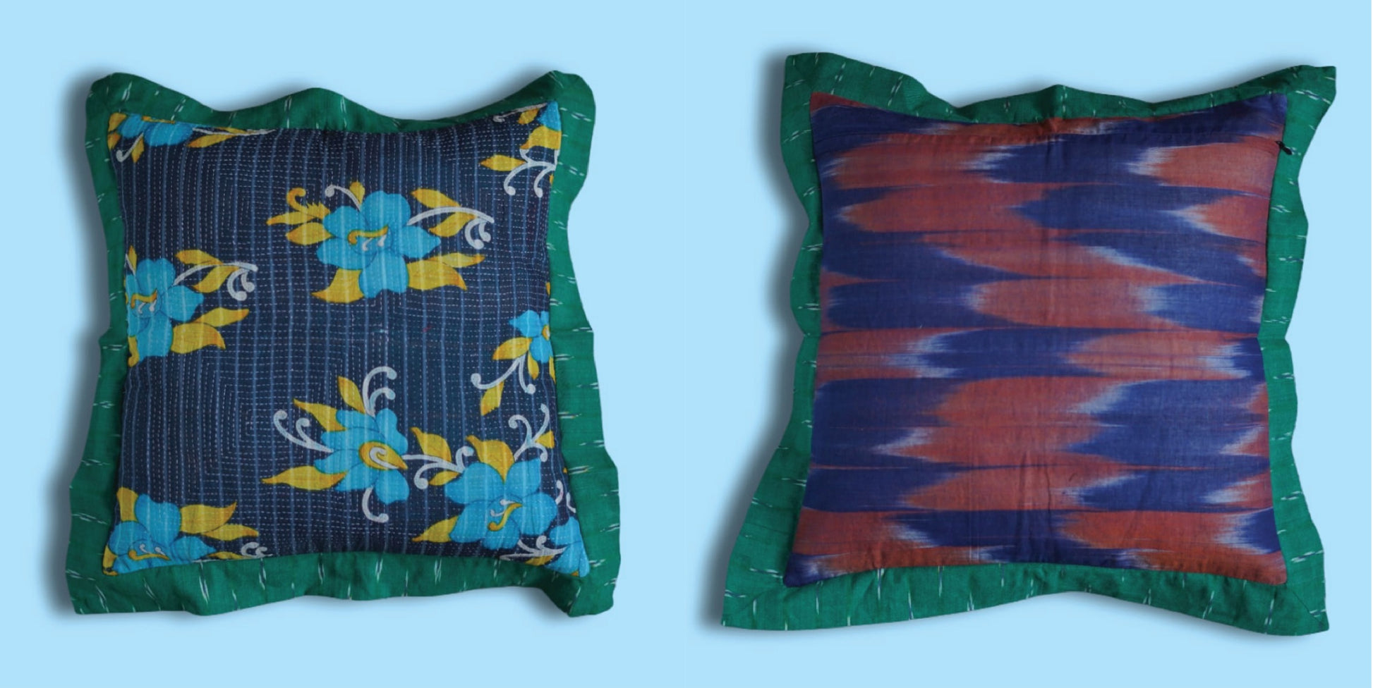 Kantha embroidery, is known for its delicate yet durable stitching, which creates texture and character in every piece. Flip the pillow over to reveal handwoven Ikat, an ancient dyeing technique where the yarns are tie-dyed before weaving, resulting in soft, blurred patterns that exude artisanal charm.