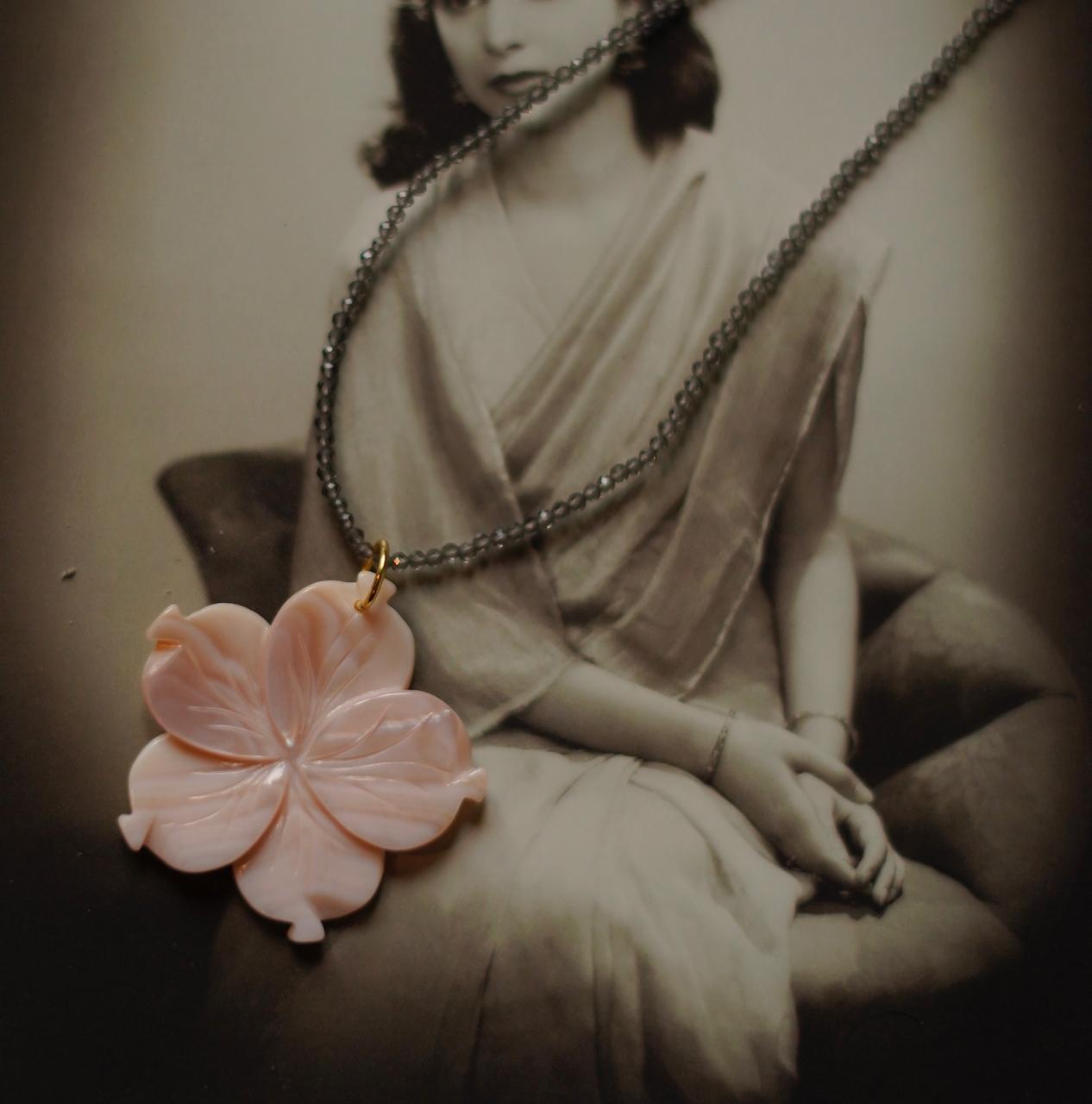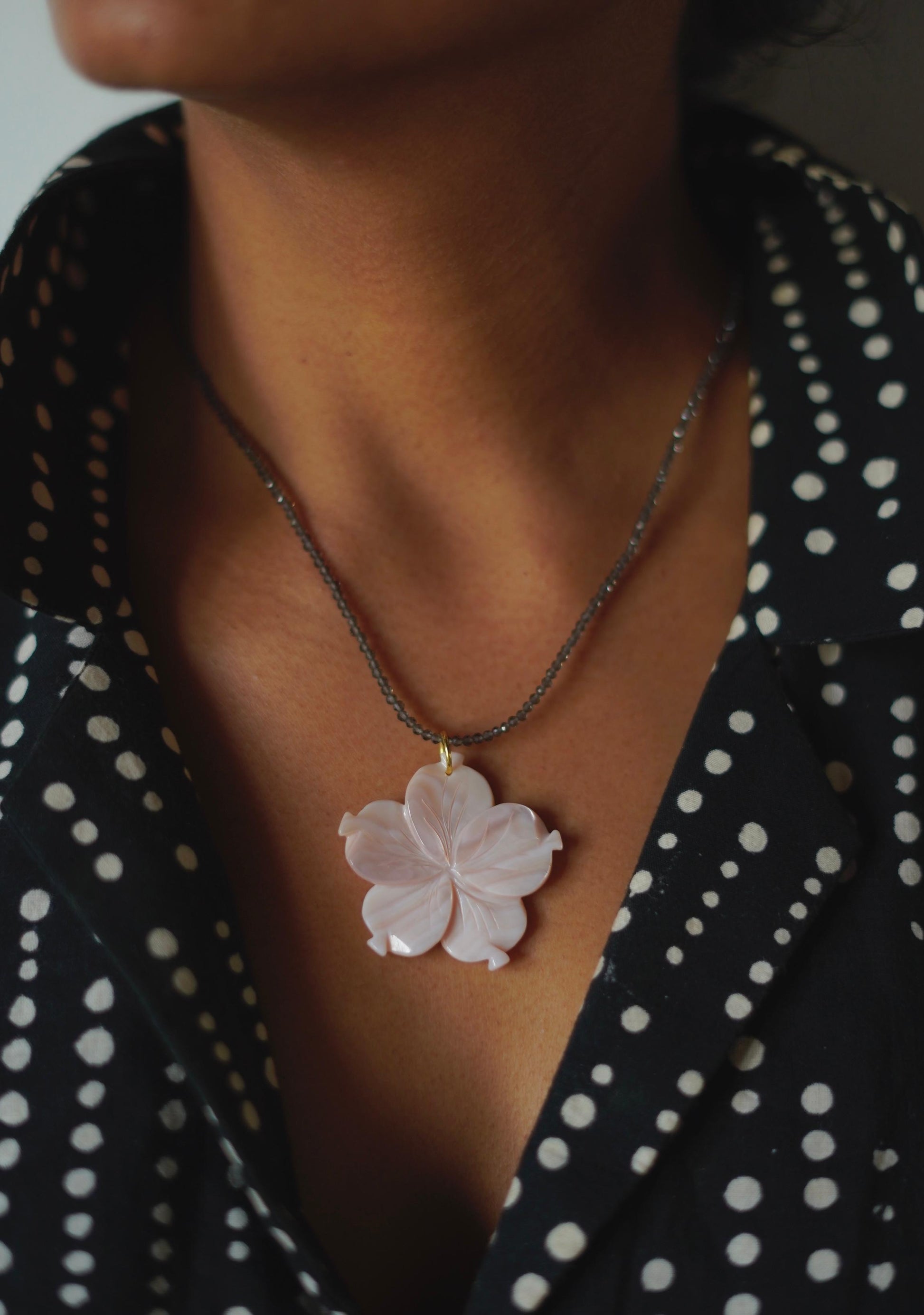 This 17-inch necklace features faceted smokey quartz beads strung delicately with a hand-carved vintage shell flower pendant. The soft blush hues of the shell glow while the smokey quartz adds grounding energy.