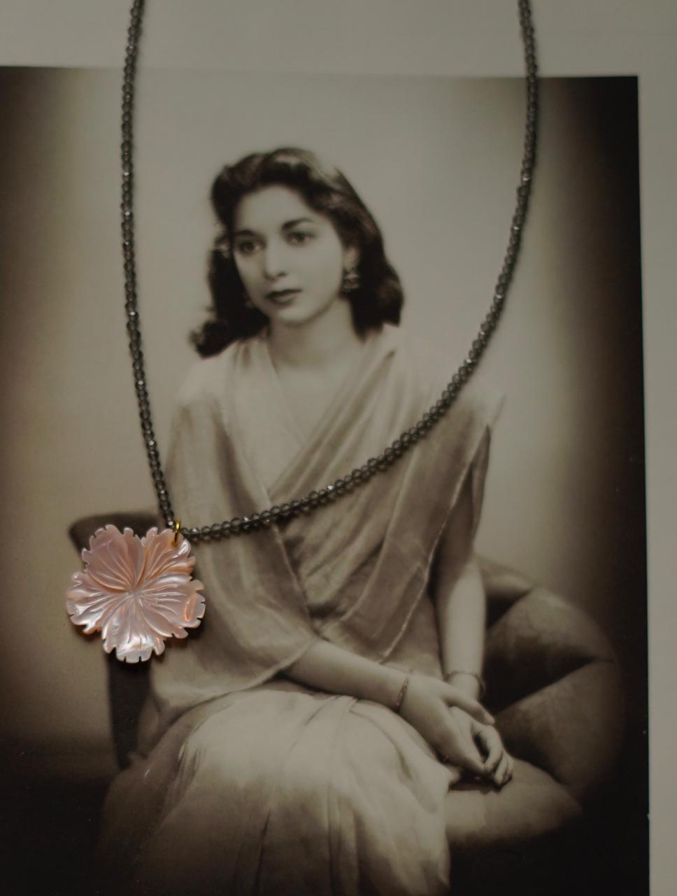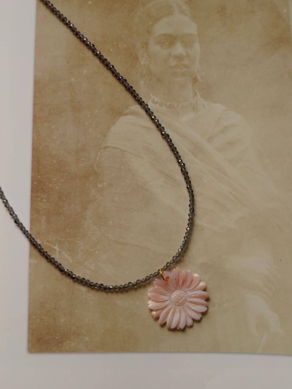 This 17-inch necklace features faceted smokey quartz beads strung delicately with a hand-carved vintage shell flower pendant. The soft blush hues of the shell glow while the smokey quartz adds grounding energy.