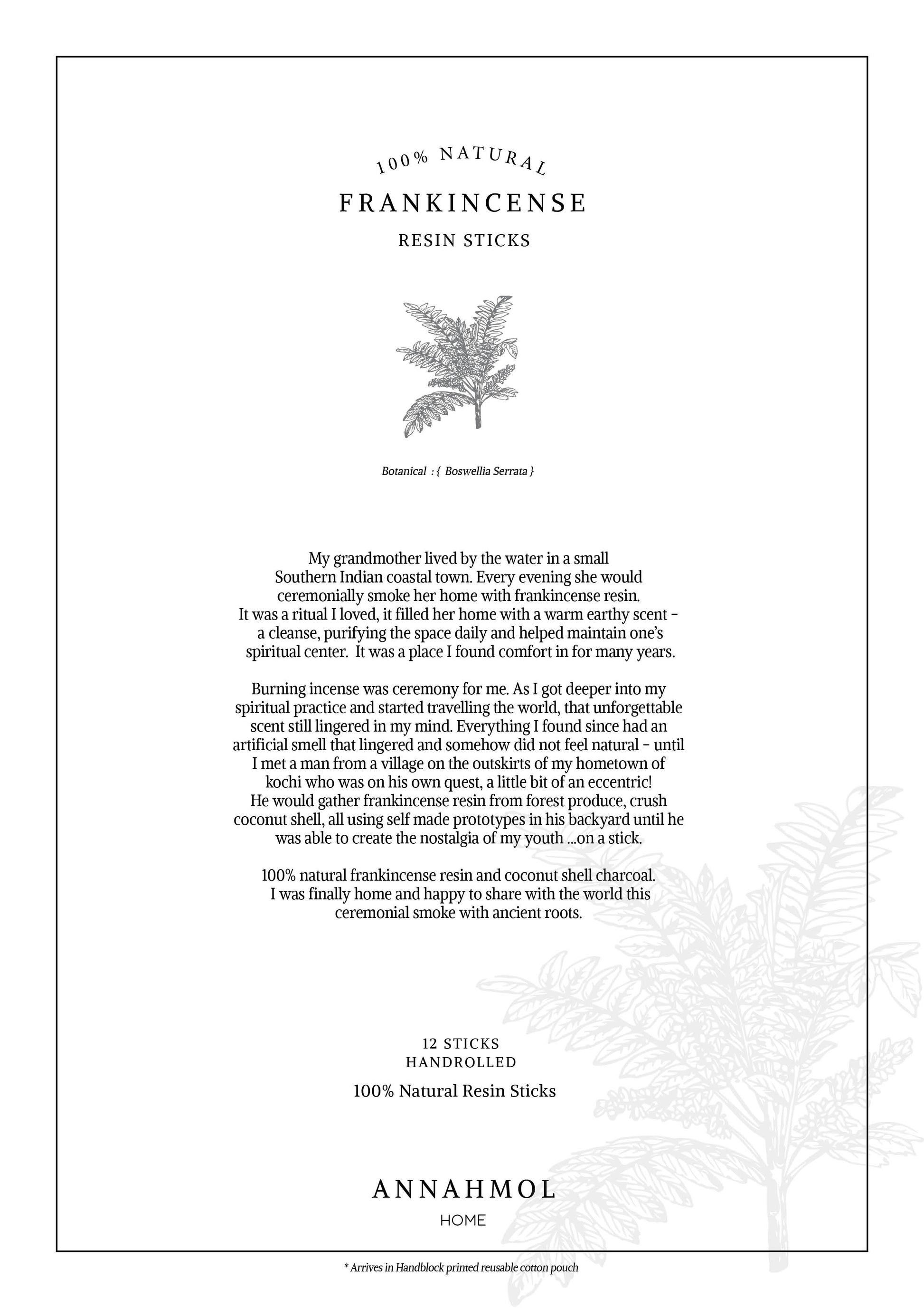 My grandmother lived by the water in Kochi, Kerala. Every evening, she would ceremonially smoke her home with frankincense resin.