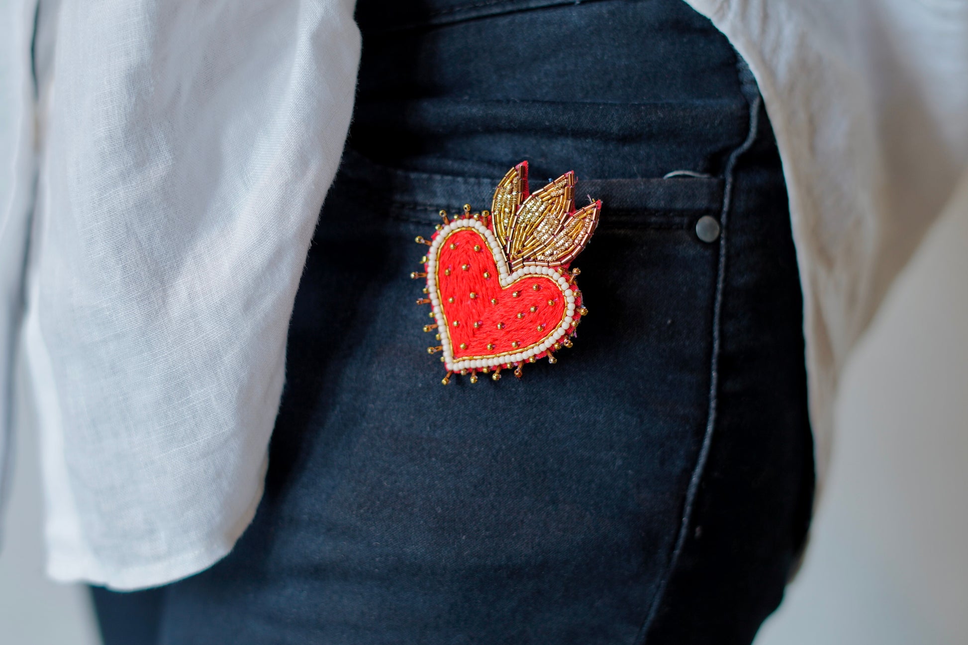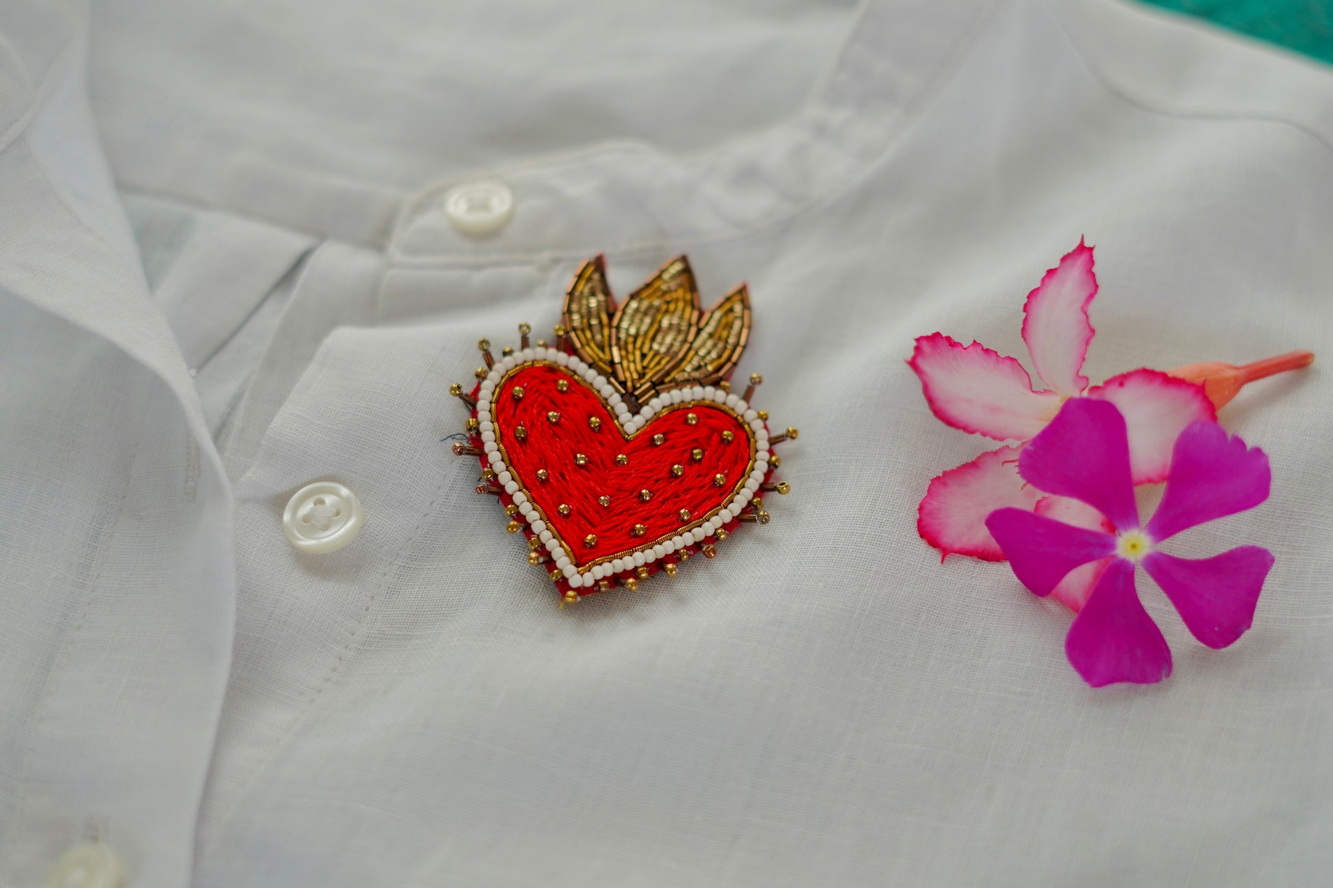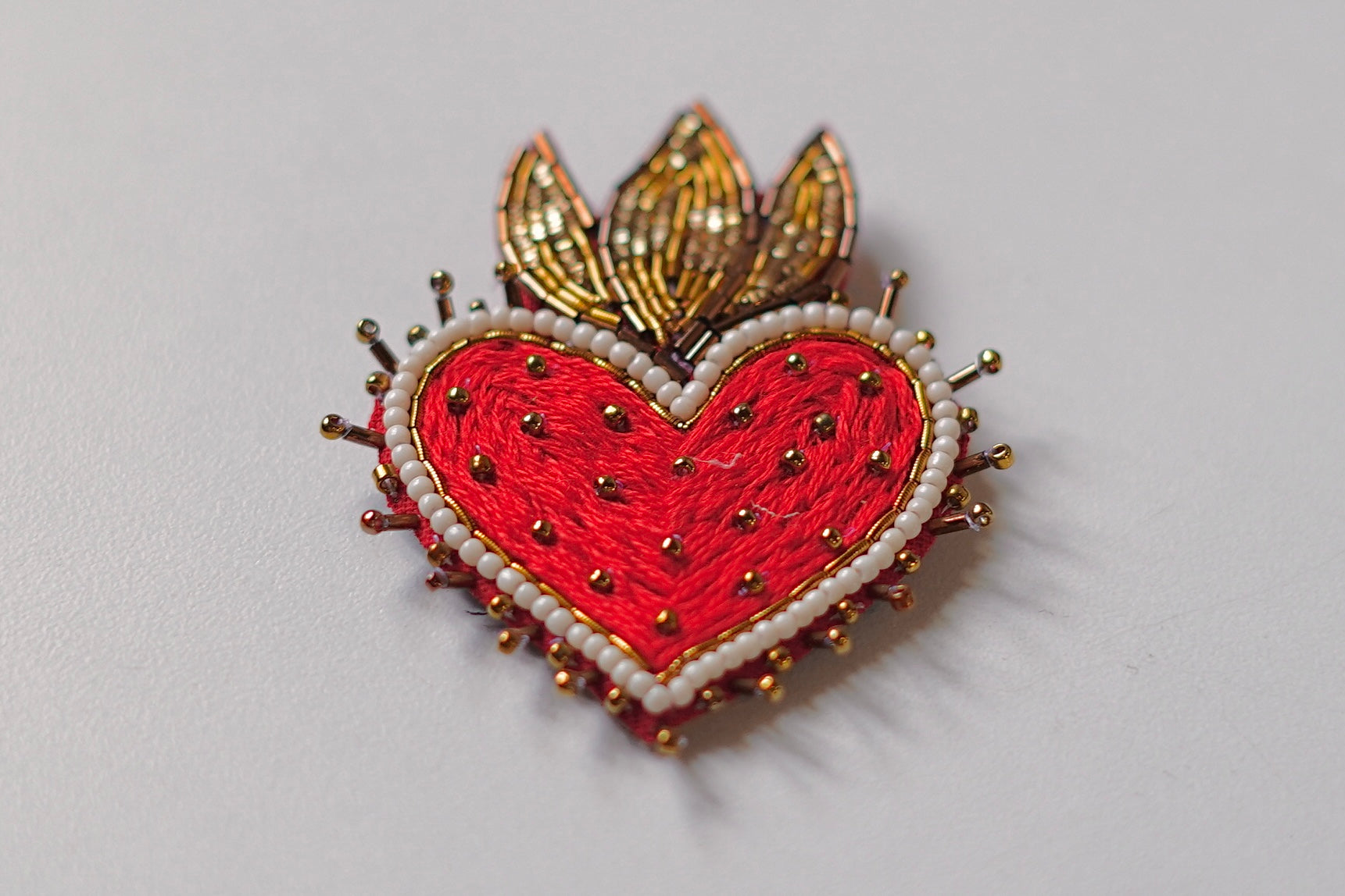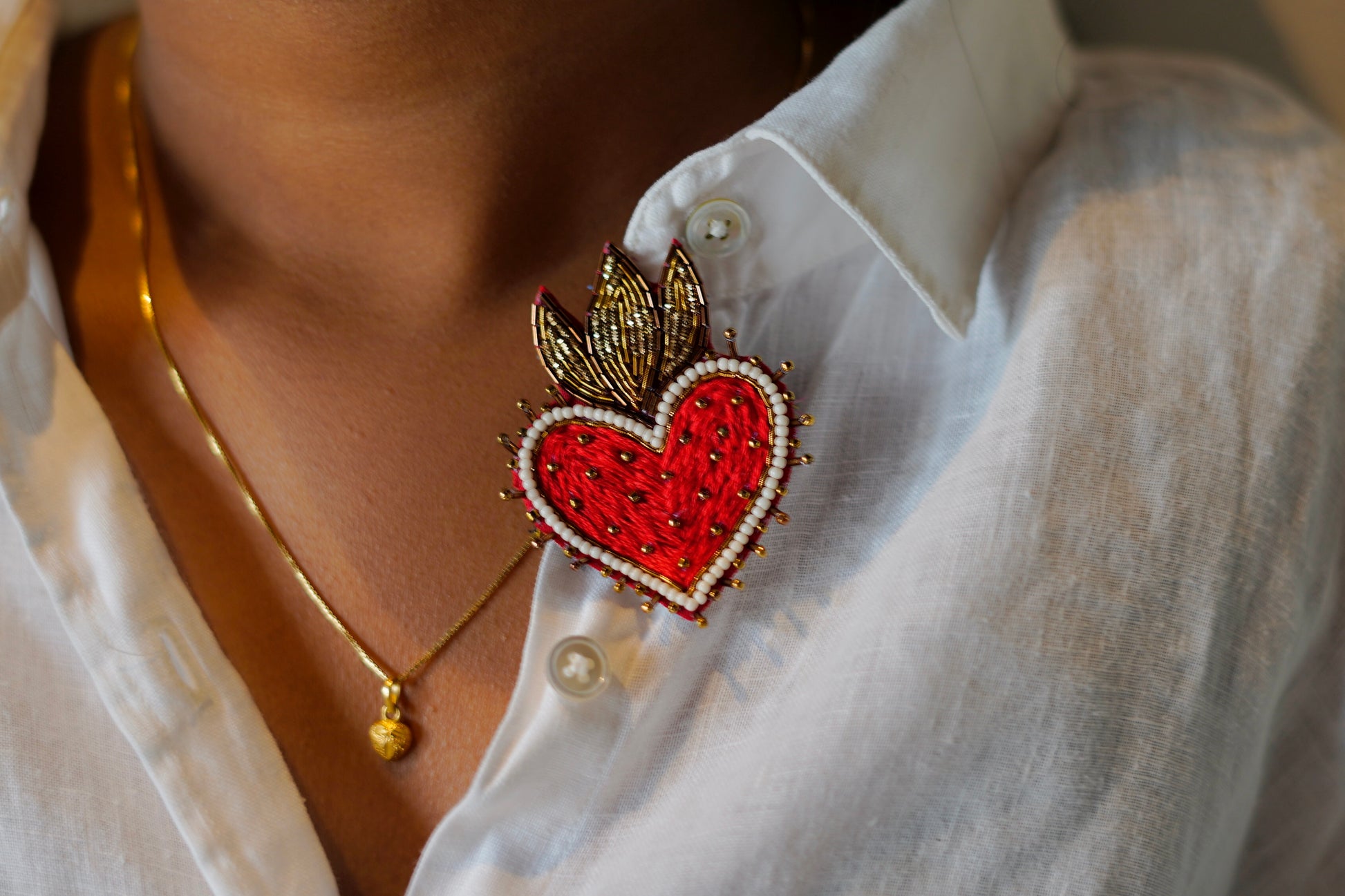 These brooches are a small works of art — hand-embroidered using traditional Indian techniques that celebrate India's rich textile heritage. Intricately beaded and stitched, the design is inspired by the sacred heart.