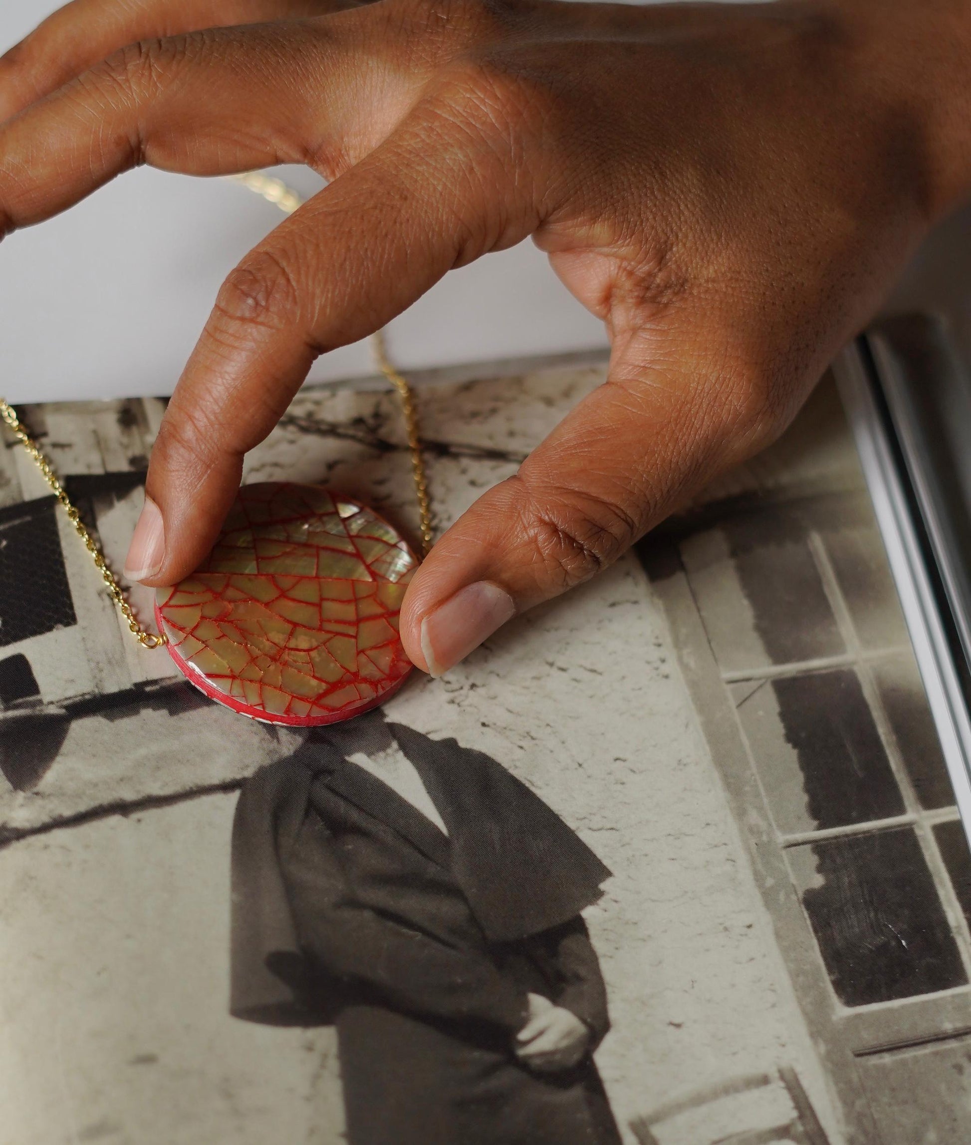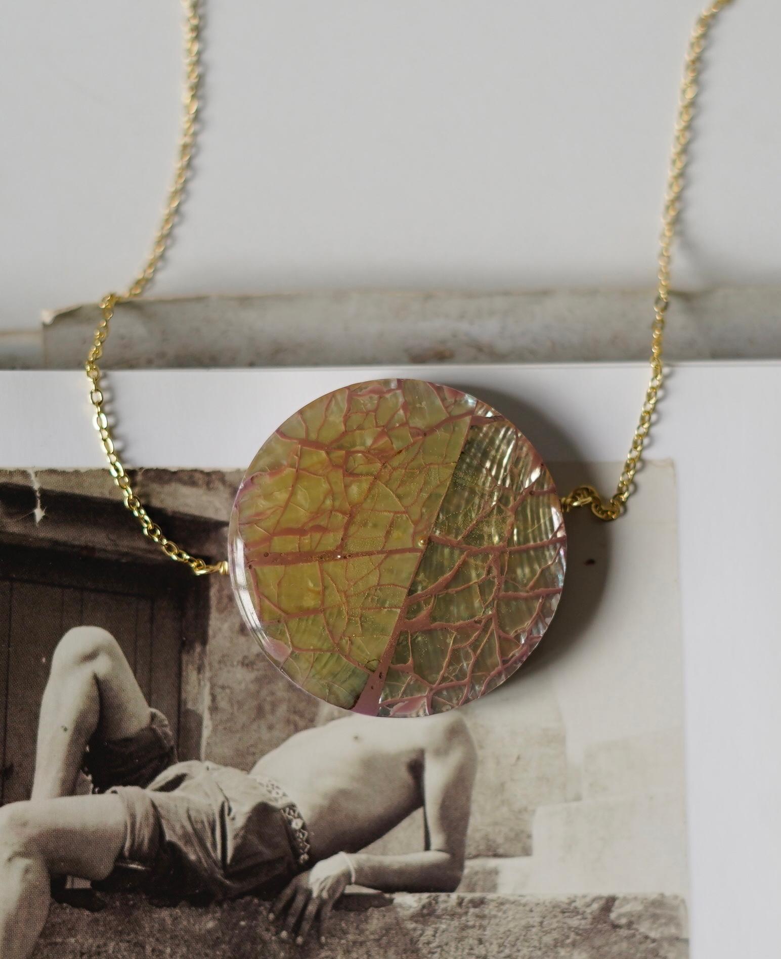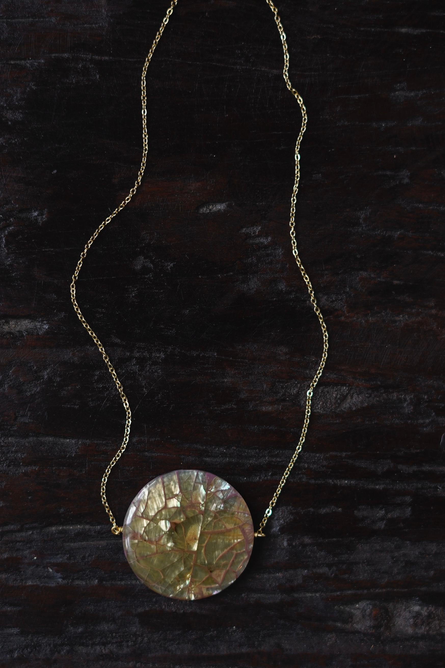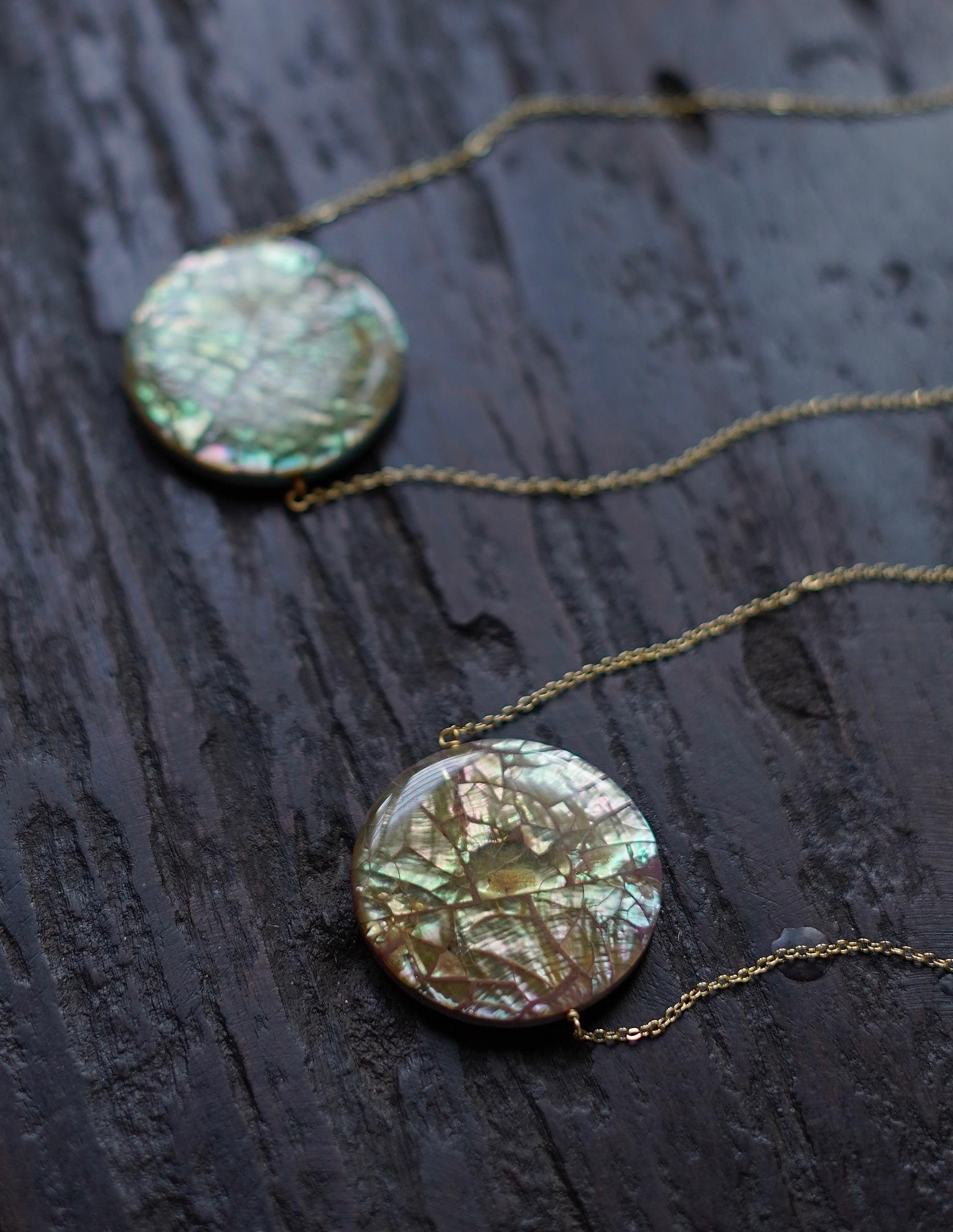 A little moonlight captured in a pendant — this one-of-a-kind piece features a vintage abalone shell inlaid into resin, creating a crackled mosaic of iridescent greens and warm reds that shimmer with every shift of light.