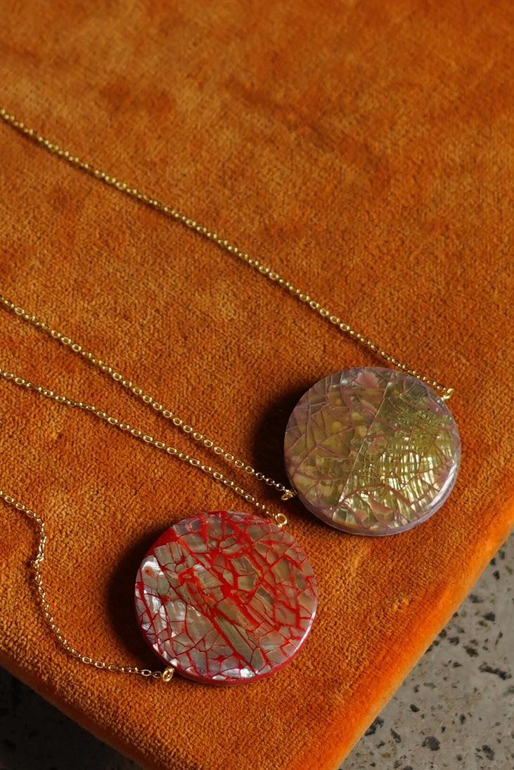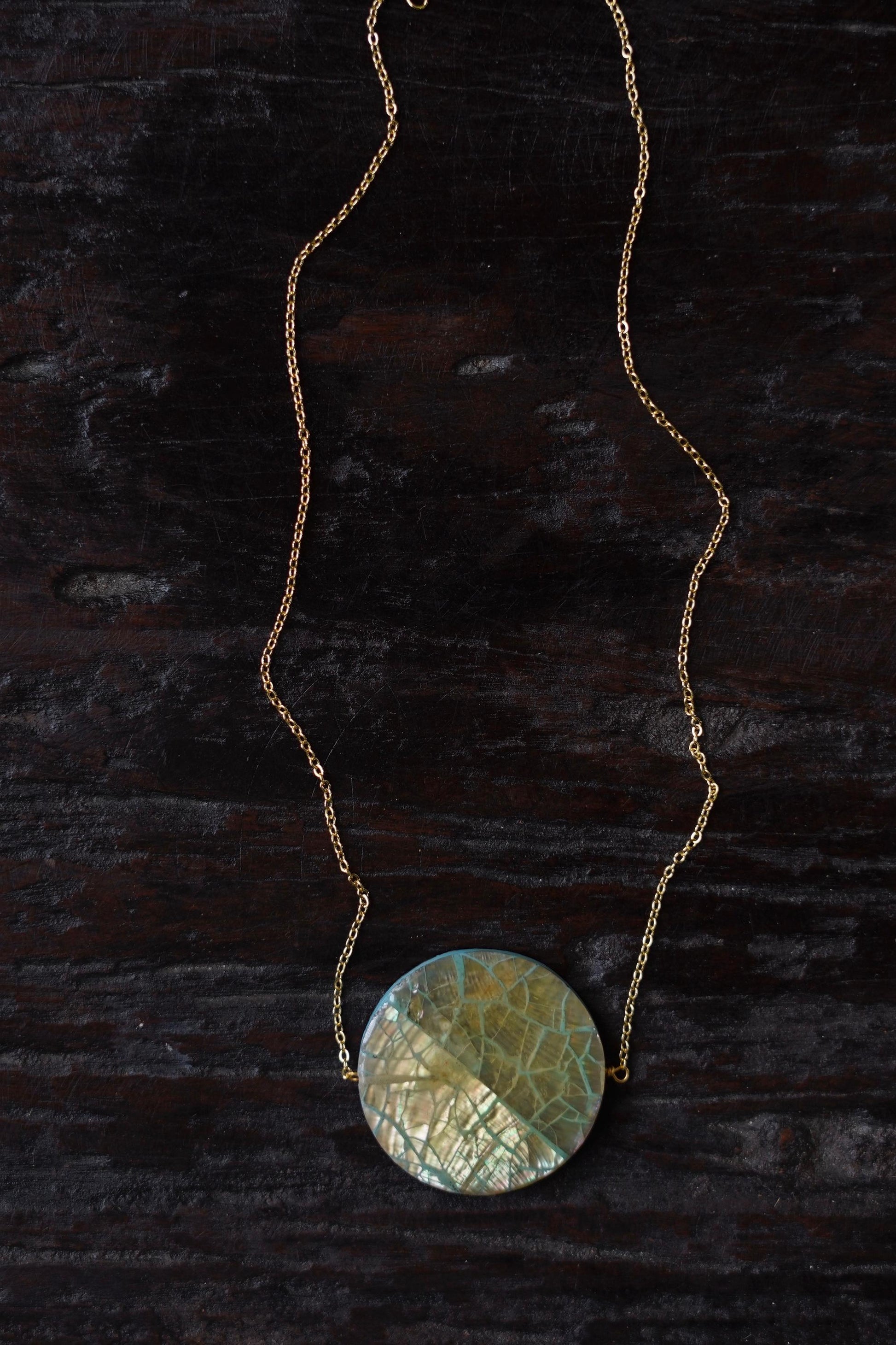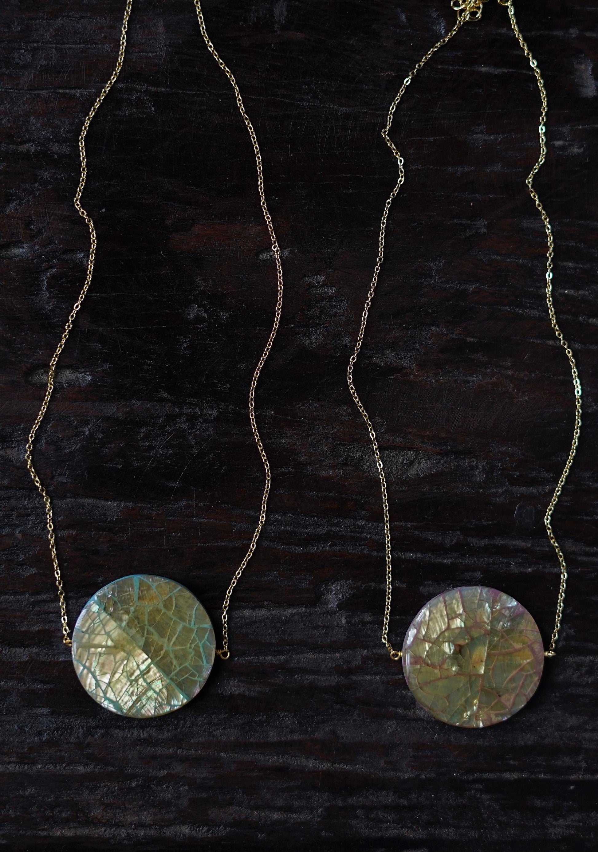 A little moonlight captured in a pendant — this one-of-a-kind piece features a vintage abalone shell inlaid into resin, creating a crackled mosaic of iridescent greens and warm reds that shimmer with every shift of light.