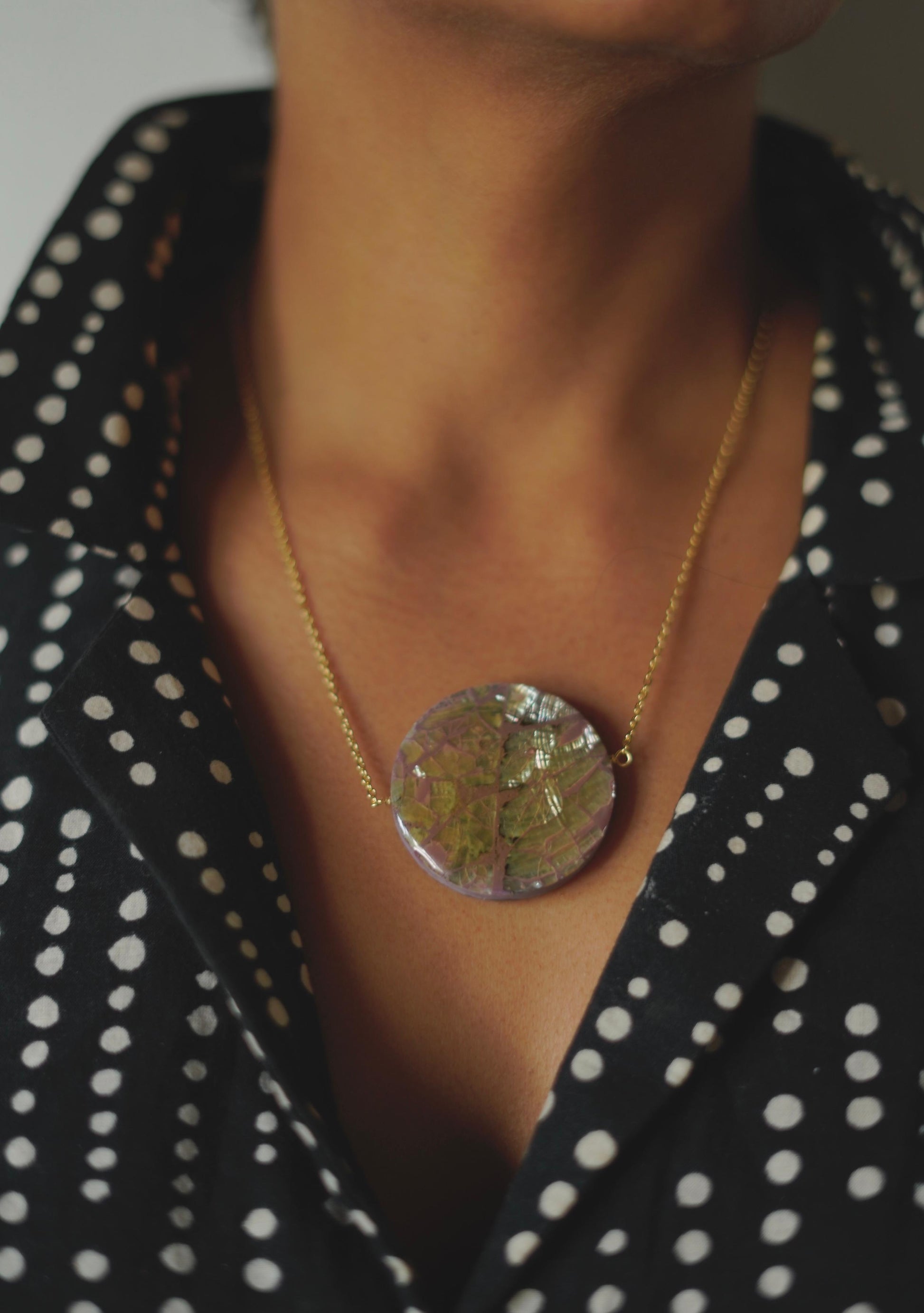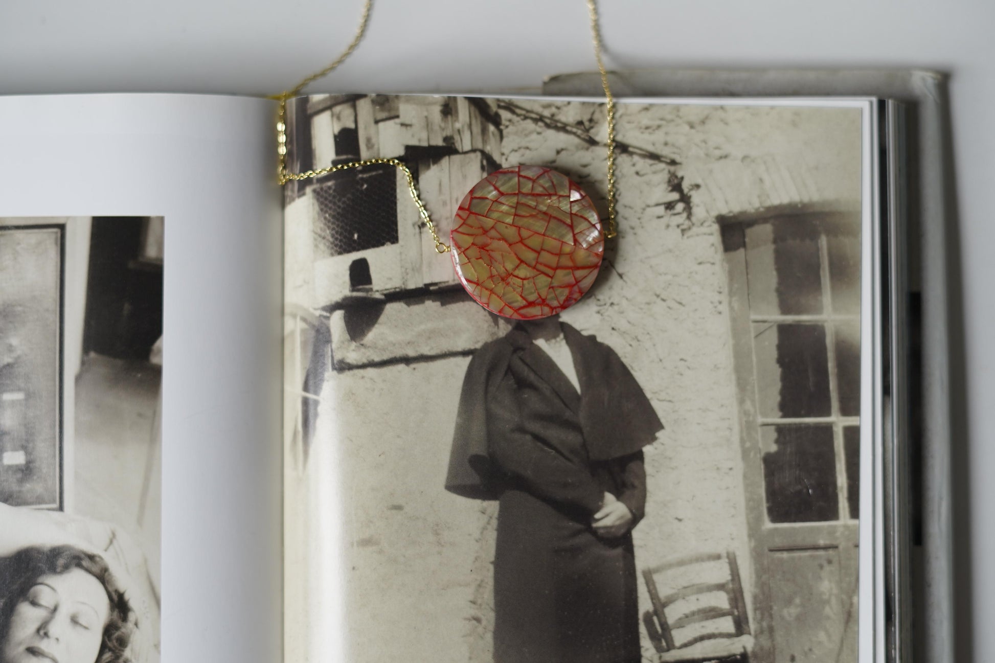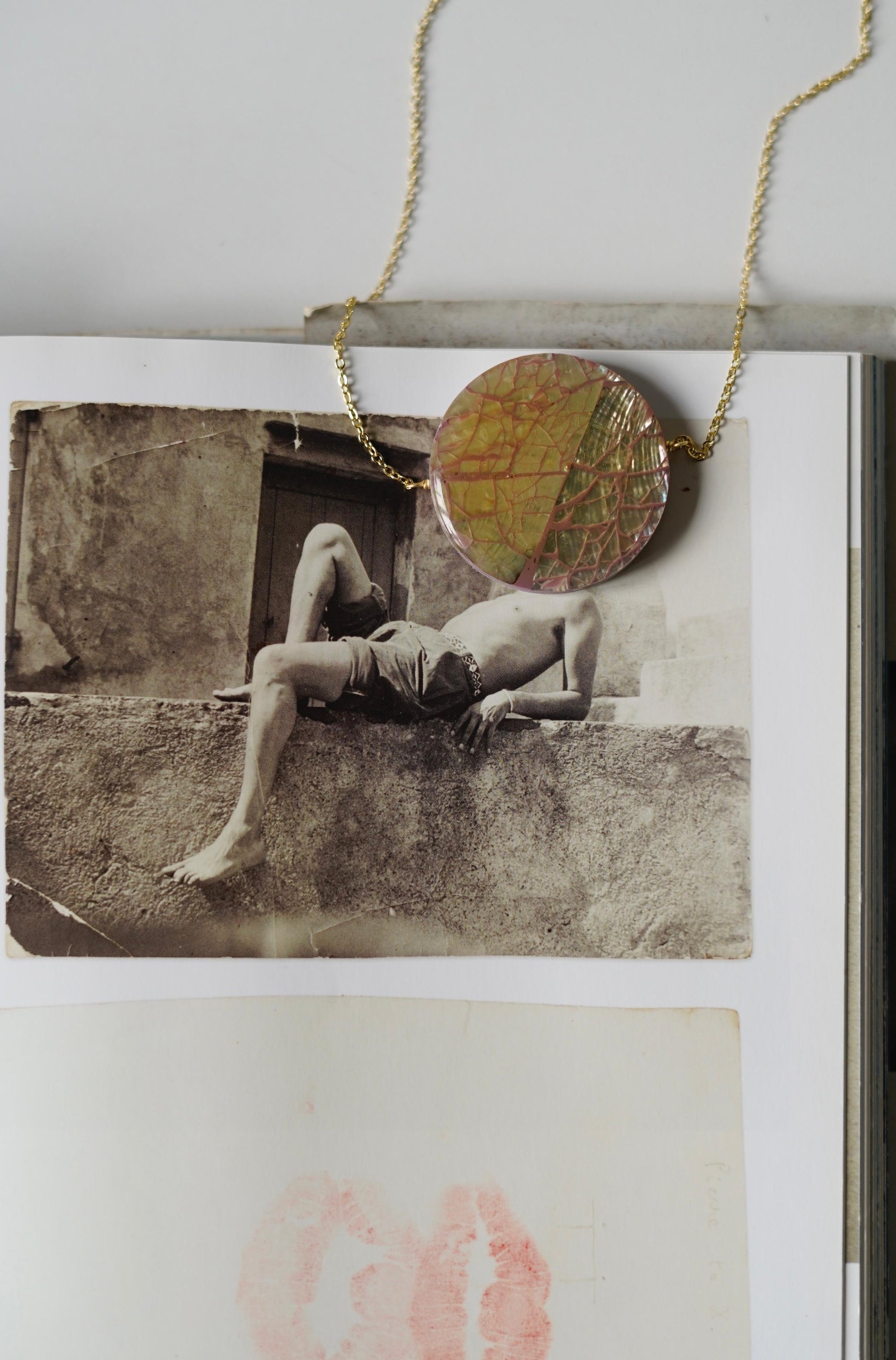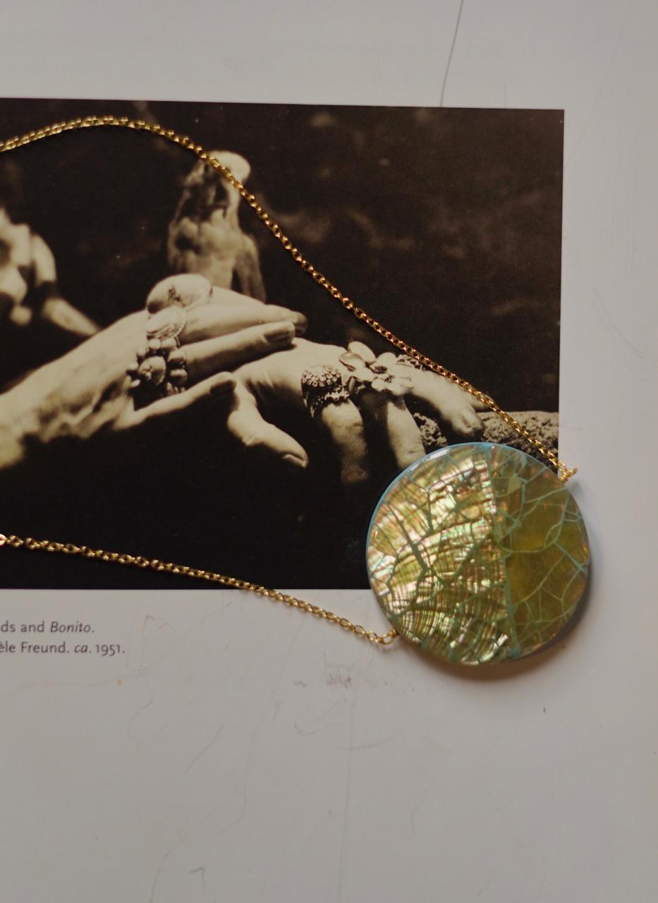 A little moonlight captured in a pendant — this one-of-a-kind piece features a vintage abalone shell inlaid into resin, creating a crackled mosaic of iridescent greens and warm reds that shimmer with every shift of light.