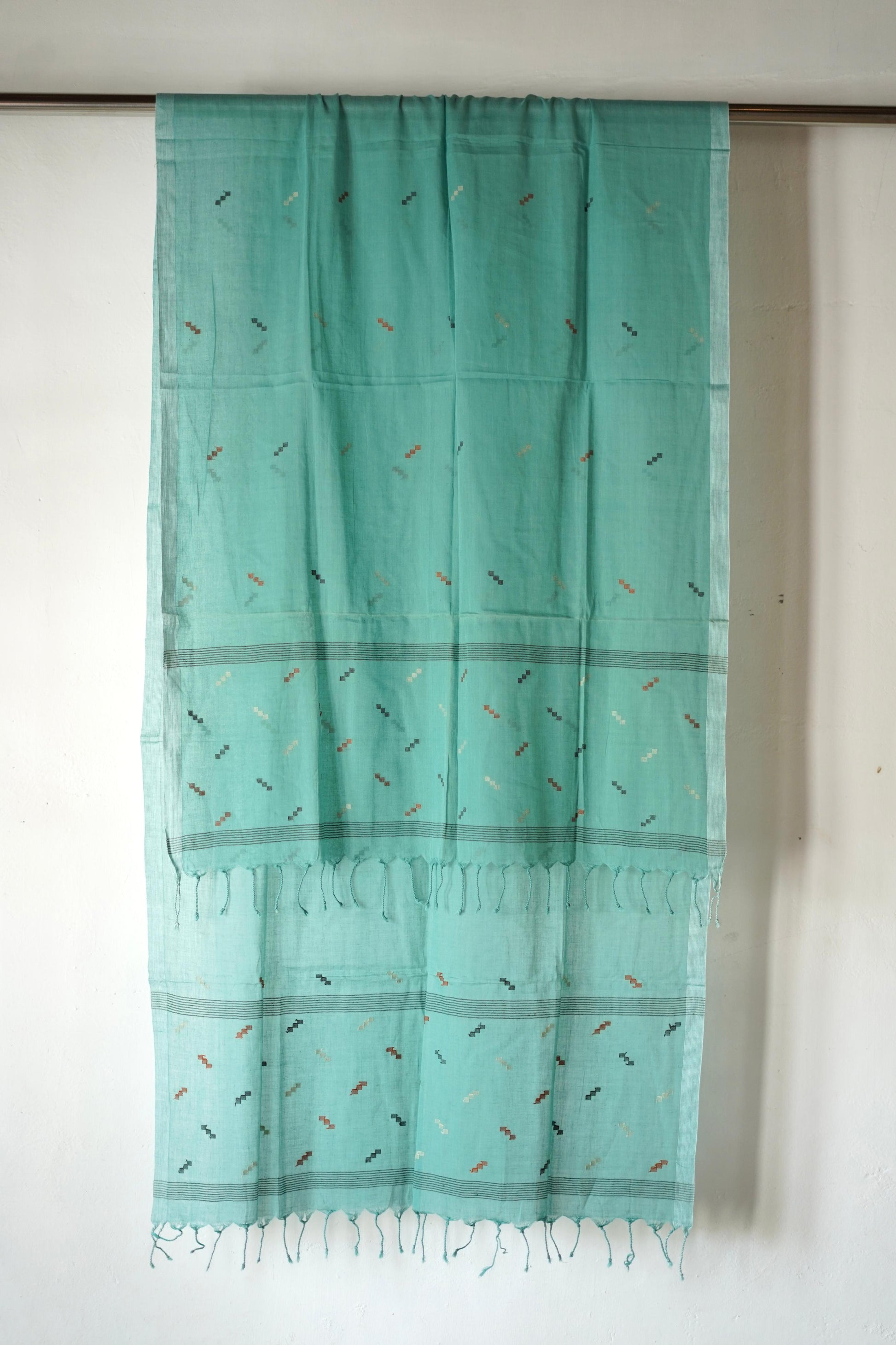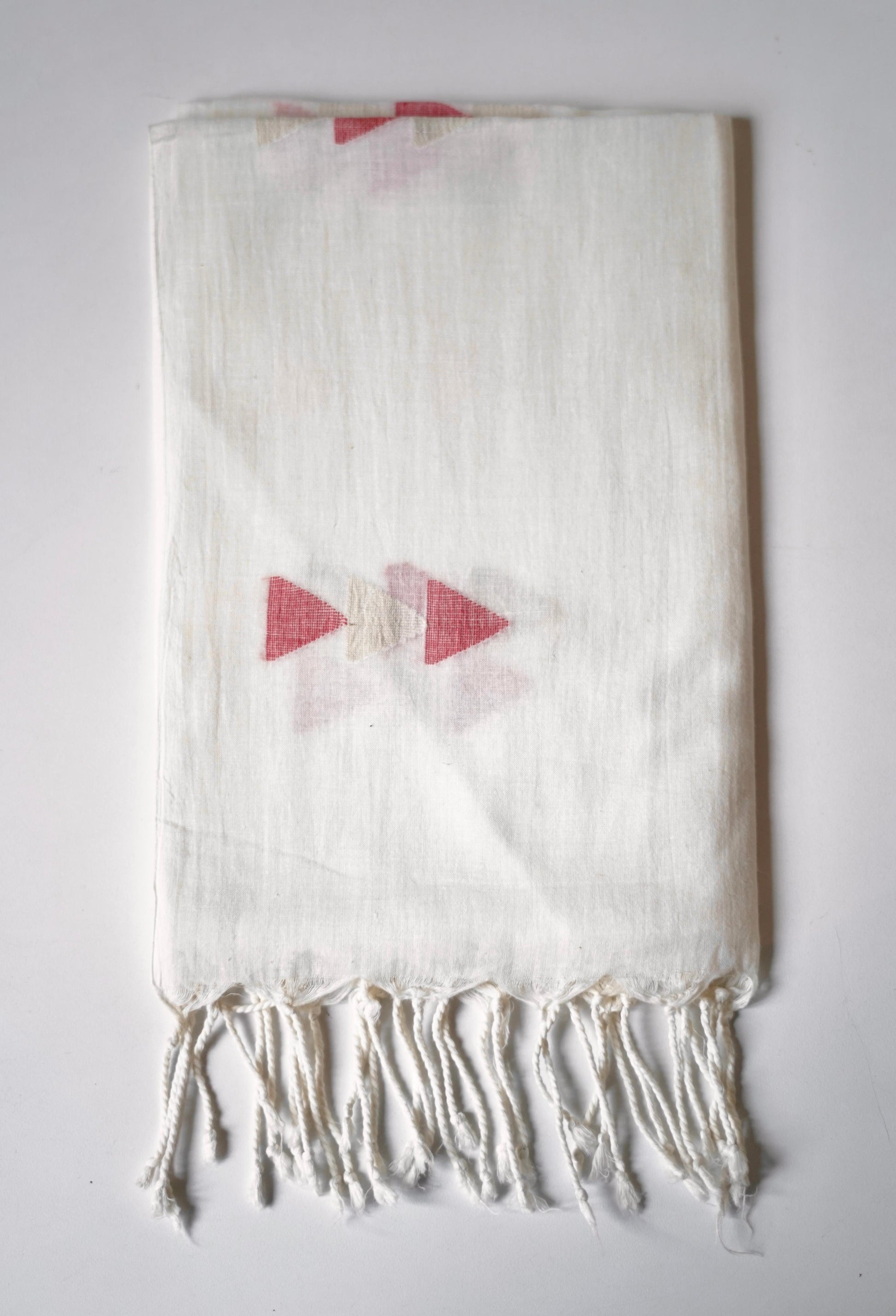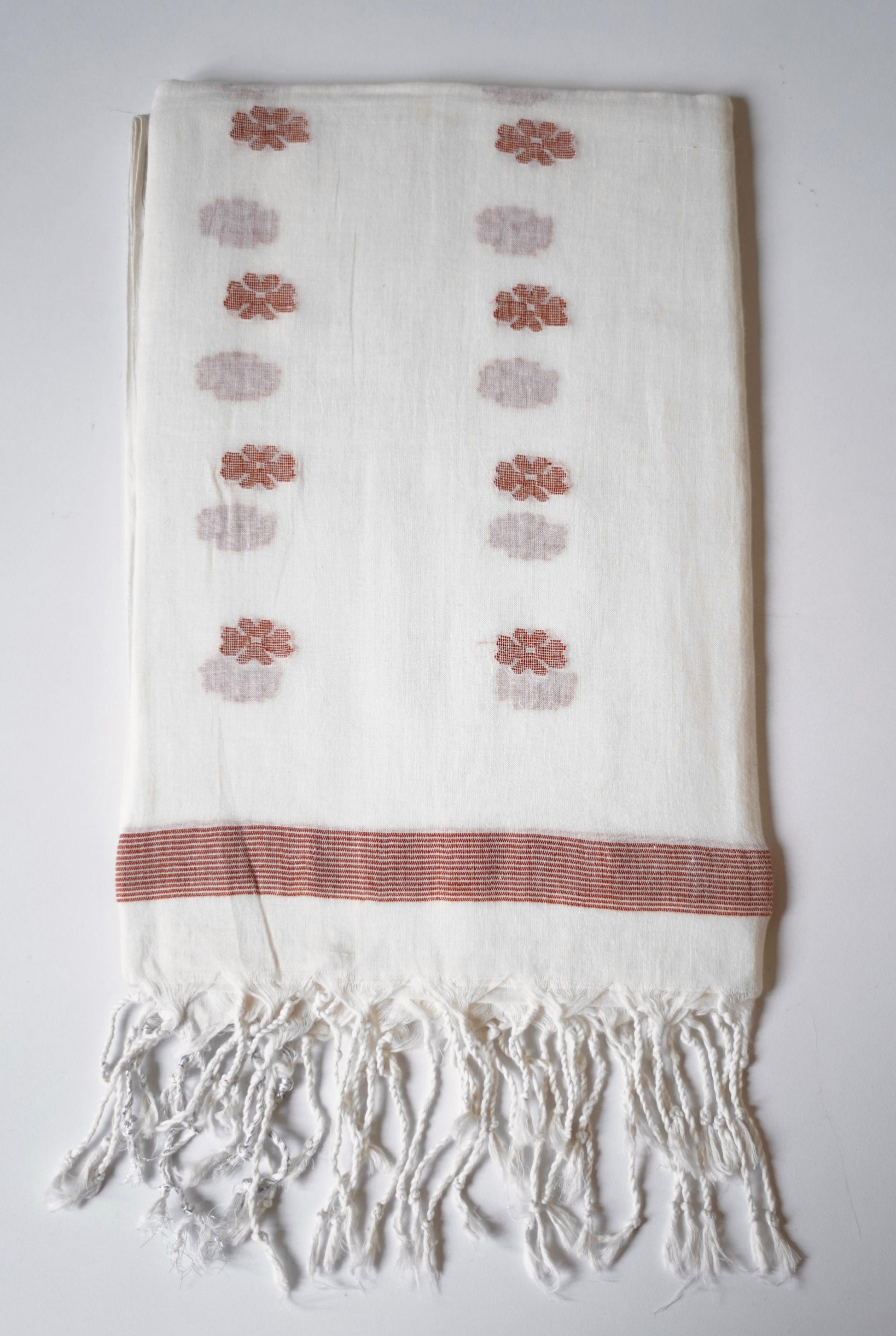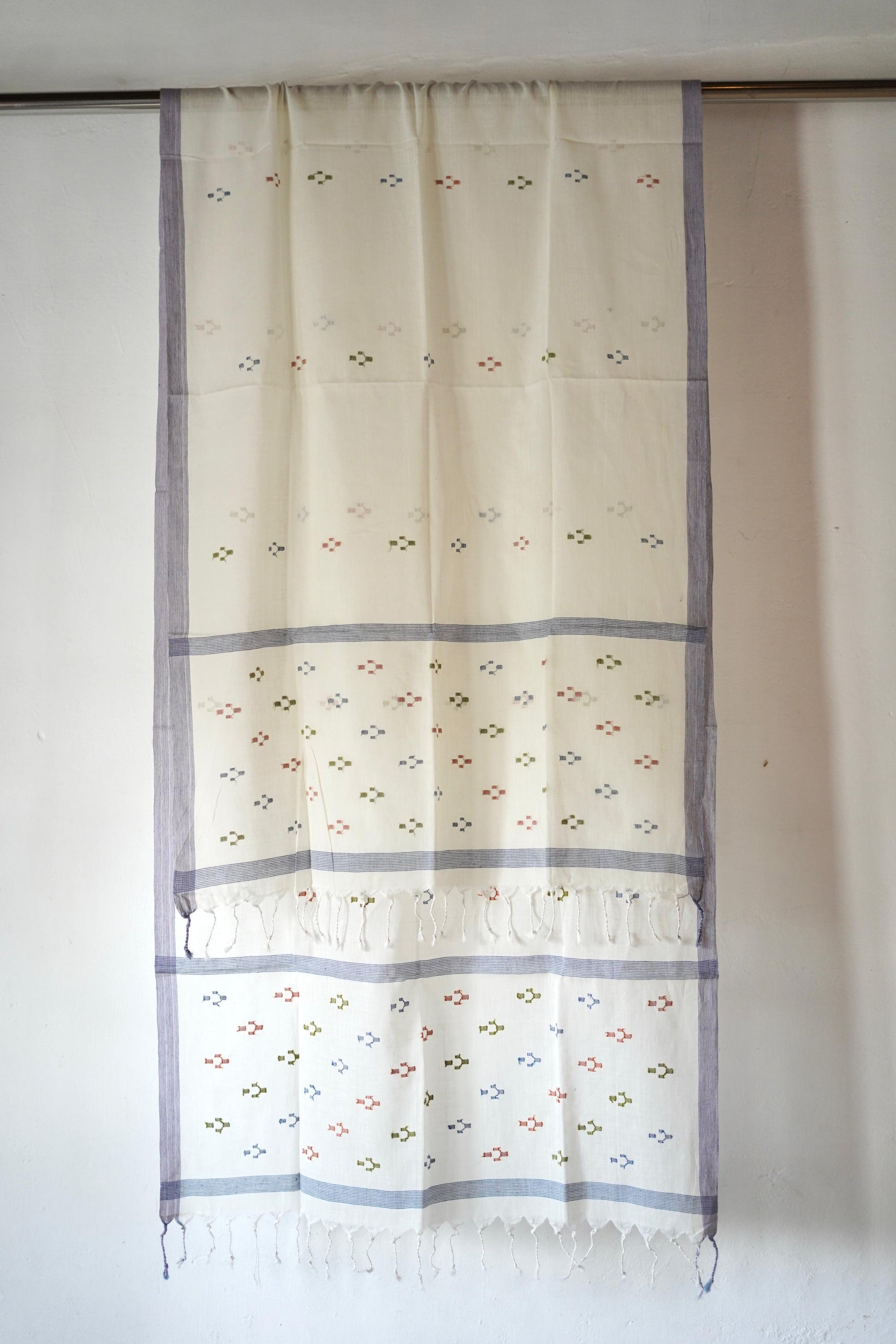 Each scarf is crafted using a time-honored weaving technique, an art form that originated in India centuries ago . Traditionally woven on handlooms with extra weft motifs, this type of weaving is known for its fine muslin texture and subtle, geometric patterns that seem to float within the weave.