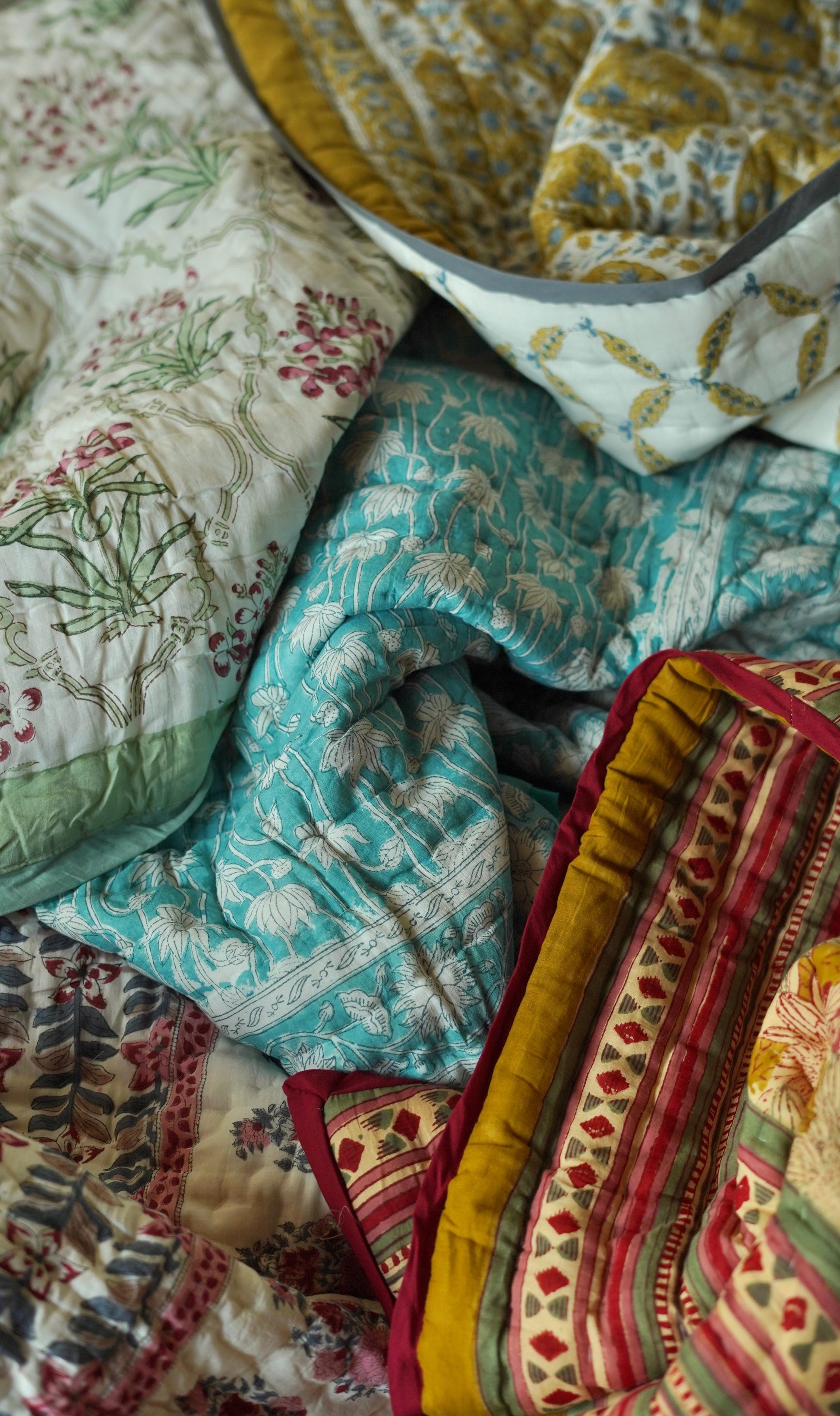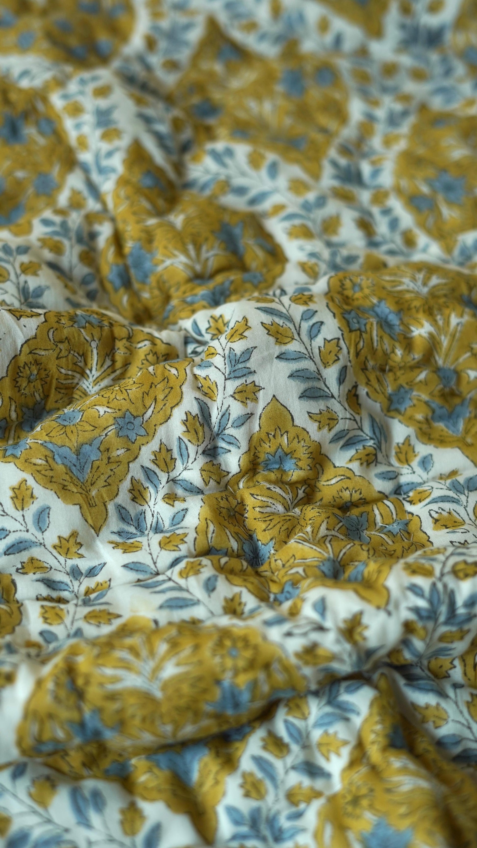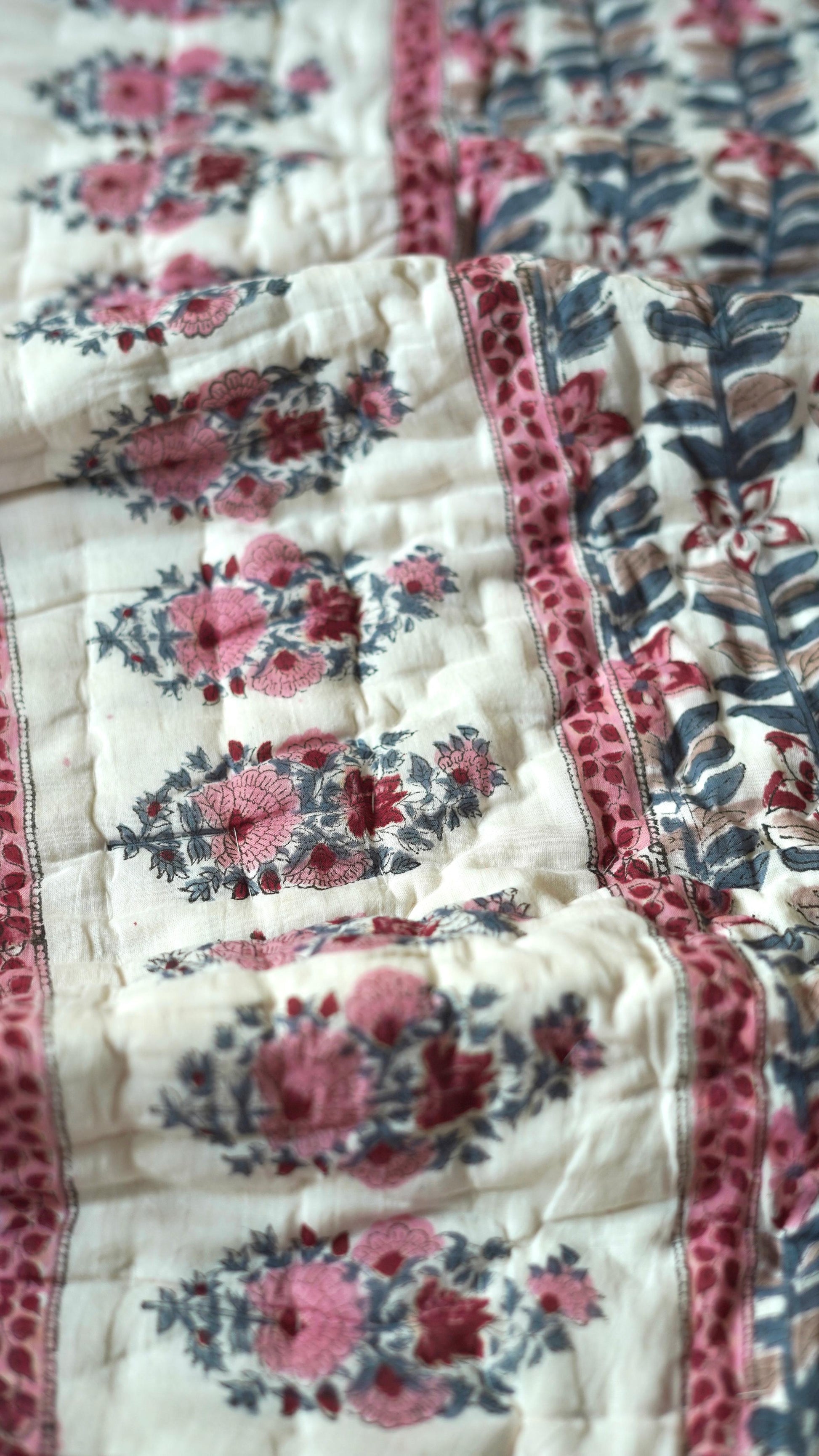 Two layers of hand block printed muslin are filled with pure cotton and fluffed.