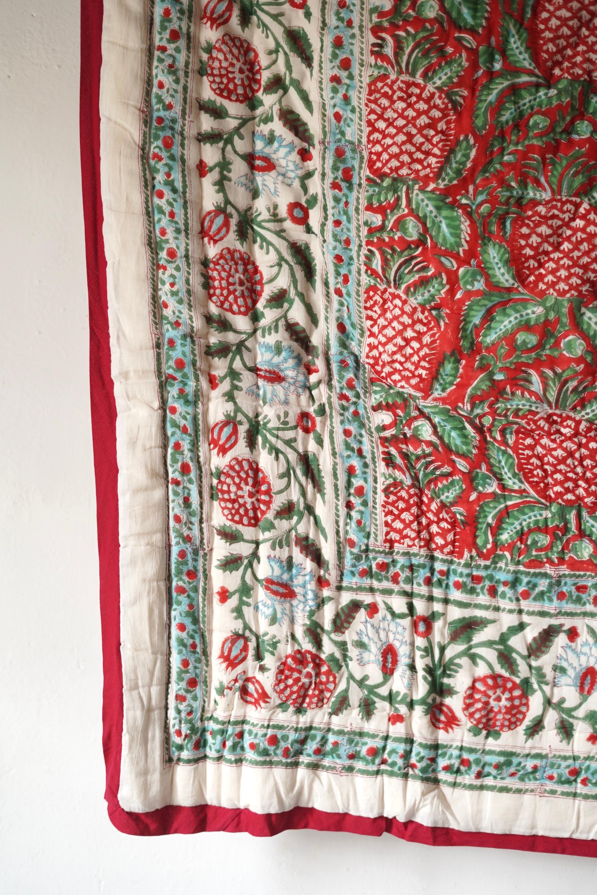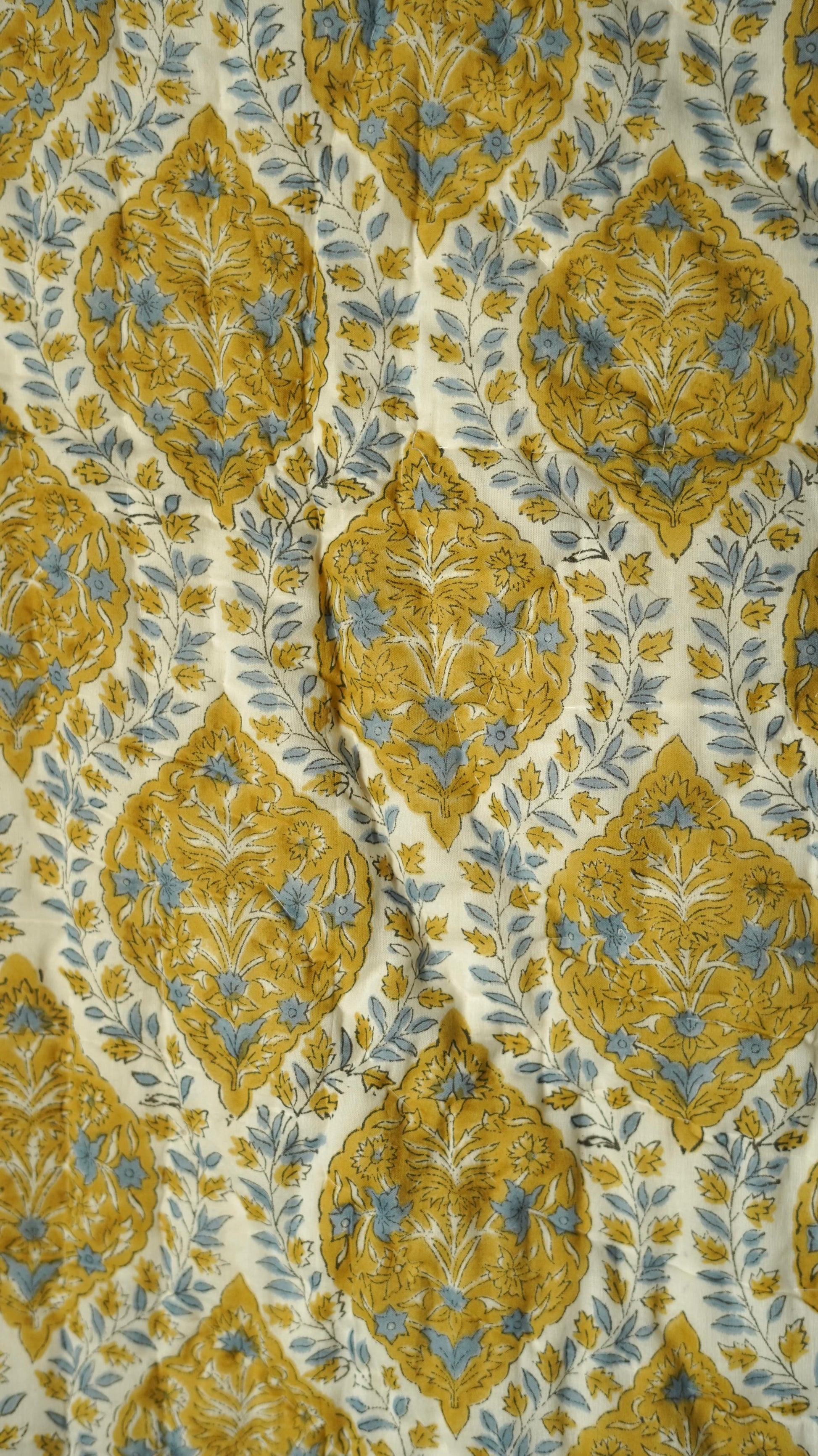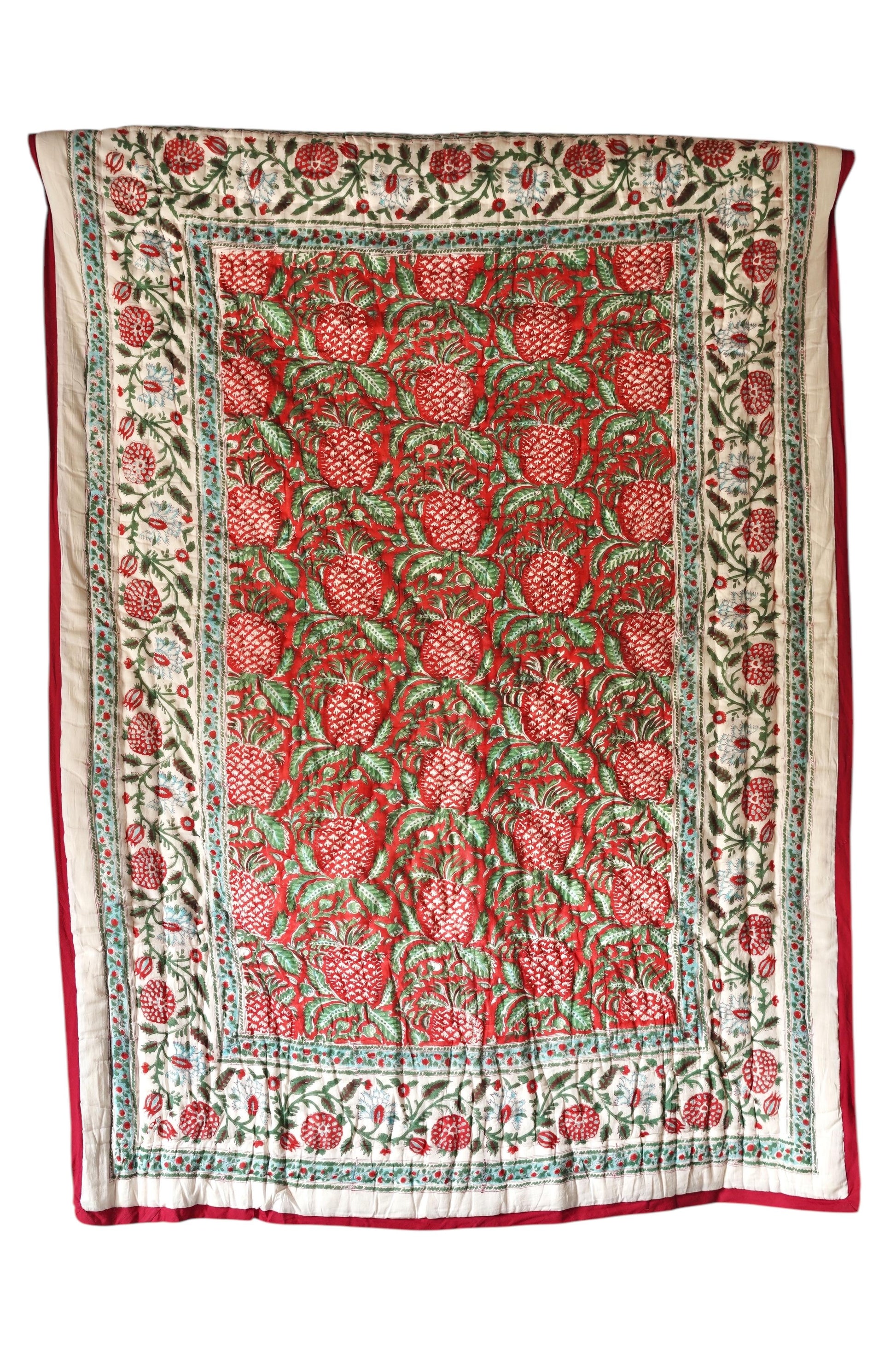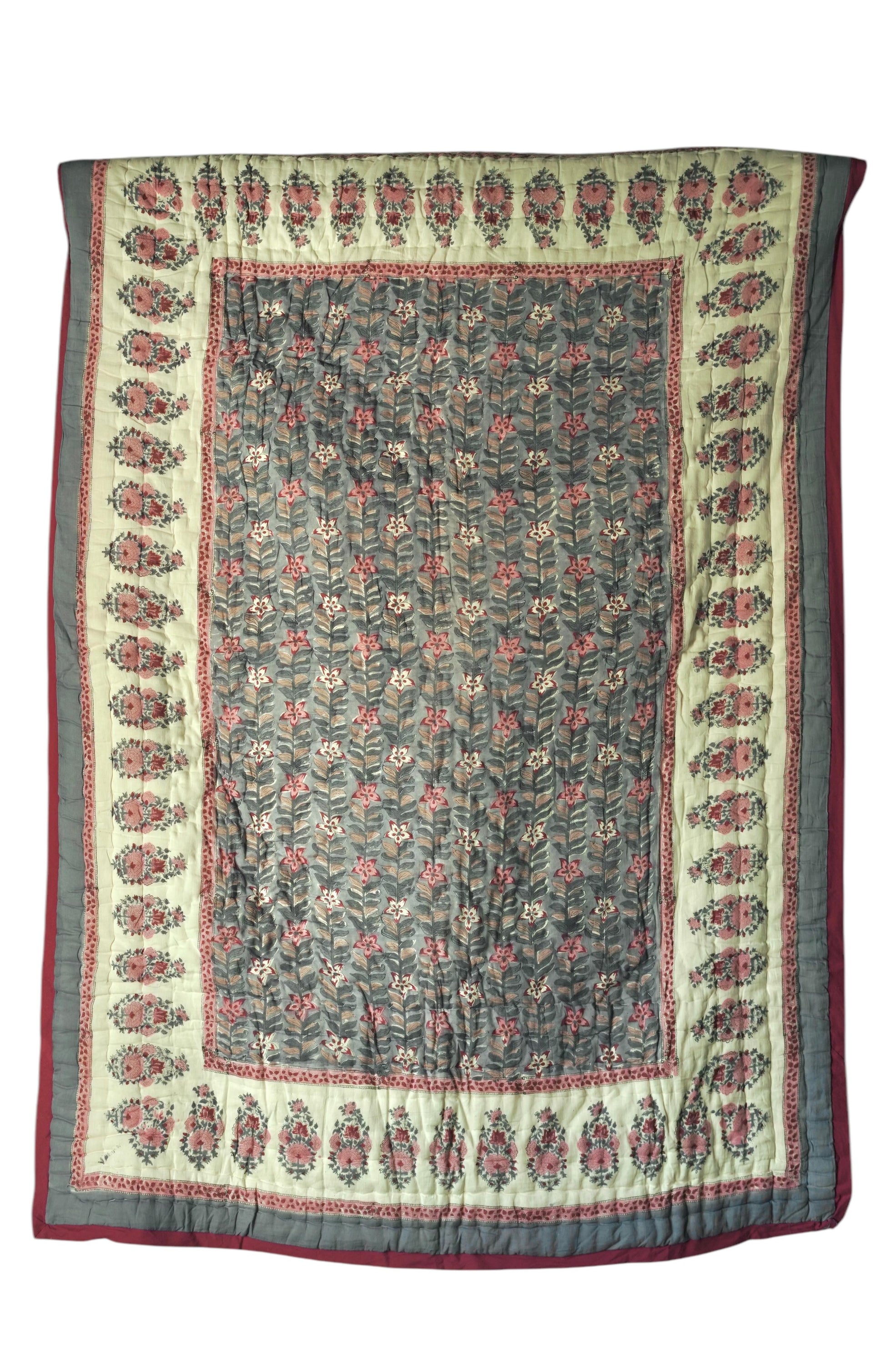 Two layers of hand block printed muslin are filled with pure cotton and fluffed.